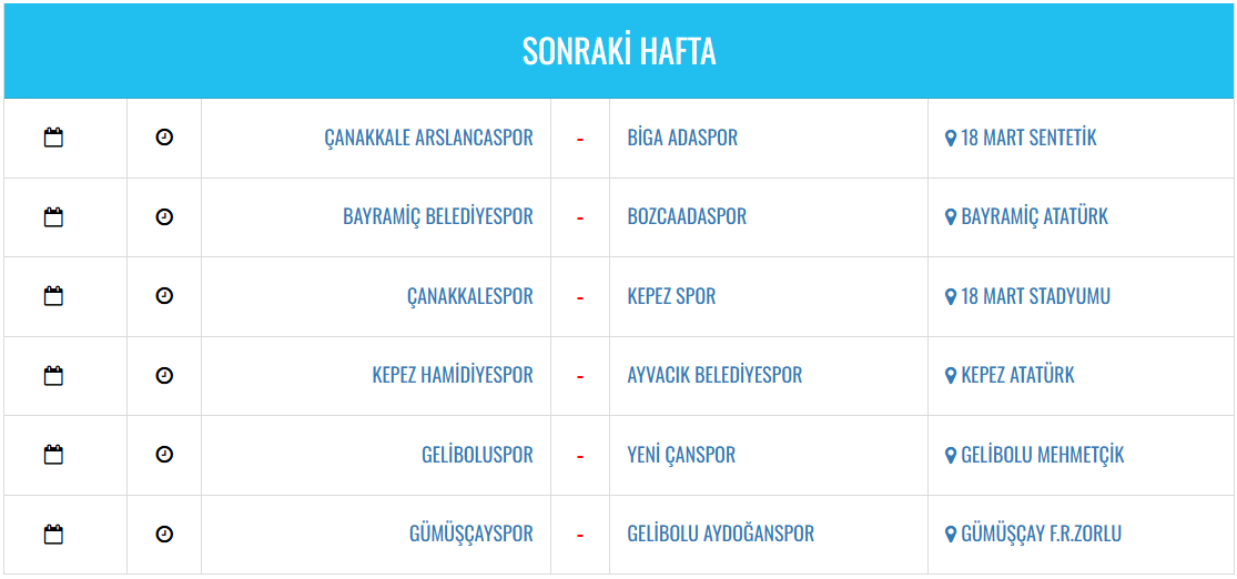 Çanakkale Süper Amatör Lig'de gelecek hafta karşılaşmalarında Biga Adaspor - Çanakkale Arslancaspor, Bozcaadaspor - Bayramiç Belediyespor, Kepez Spor - Çanakkalespor sahasında ter dökecek. Kepez Hamidiyespor - Ayvacık Belediyespor'u, Geliboluspor - Yeni Çanspor'u, Gümüşçayspor - Gelibolu Aydoğanspor'u ağırlayacak.