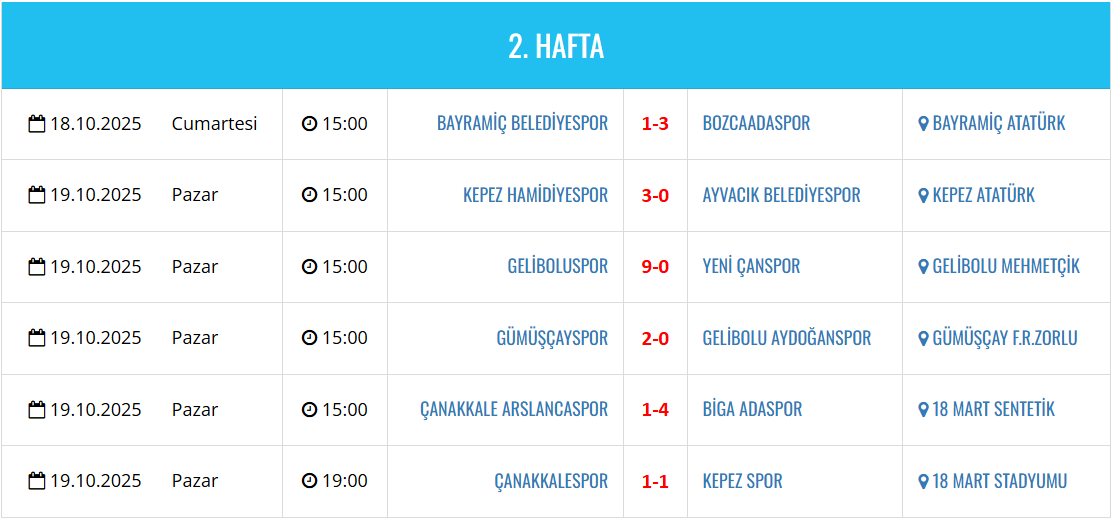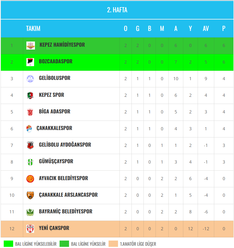 Çanakkale Süper Amatör Lig'de 2. hafta karşılaşmaları sonucunda oluşan puan tablosu şöyle;