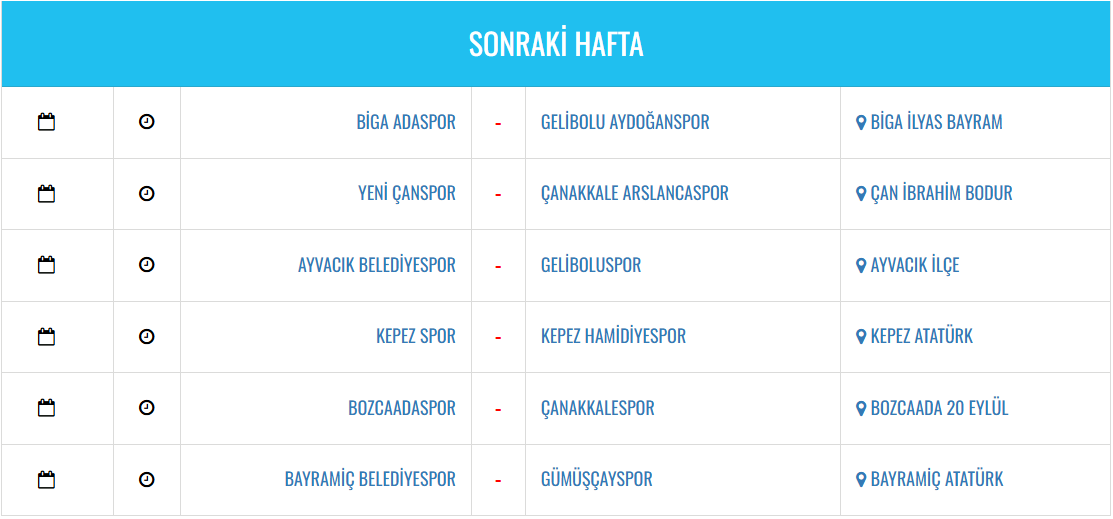 Çanakkale Süper Amatör Lig'de gelecek hafta karşılaşmalarında Gelibolu Aydoğanspor - Biga Adaspor, Çanakkale Arslancaspor - Yeni Çanspor, Geliboluspor - Ayvacık Belediyespor sahasında ter dökecek. Kepezspor - Kepez Hamidiyespor ile karşılaşacak. Bozcaadaspor - Çanakalespor'u, Bayramiç Belediyespor - Gümüşçayspor'u ağırlayacak.