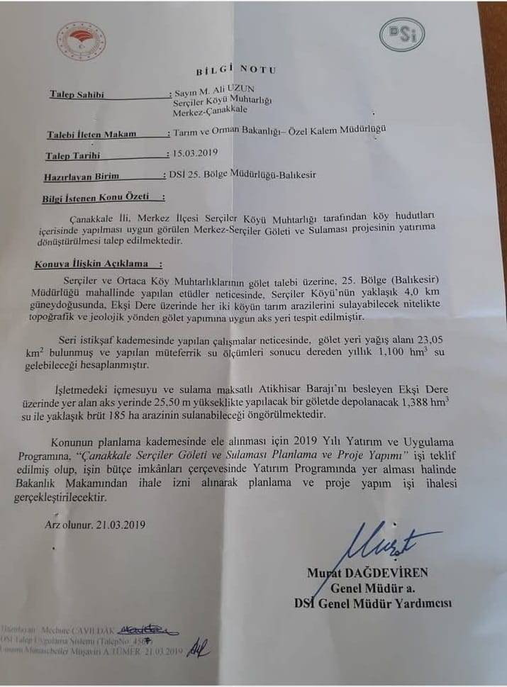 Söz konusu süreç, 2016 yılında Serçeler ve Ortaca köyü muhtarlıklarının talebiyle başladı. Bölgedeki su kaynaklarının daha verimli değerlendirilmesi amacıyla, Atikhisar Barajı ve Sarıçay’ı besleyen önemli su kaynaklarından biri olan Ekşi Dere üzerine gölet yapılması istendi.