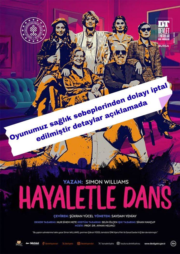 Tiyatro programında yer alan “Hayaletle Dans” oyununun sağlık sebepleri nedeniyle iptal edildiği açıklandı. Organizasyon yetkilileri tarafından yapılan duyuruda, oyunun planlanan tarihte sahnelenemeyeceği belirtildi.