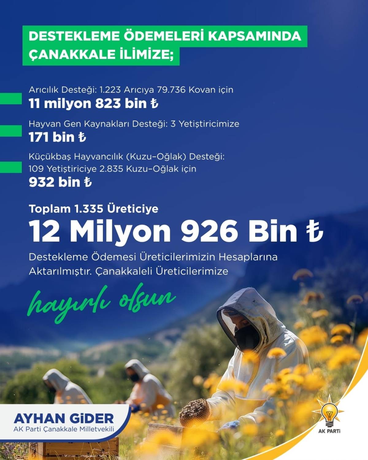 AK Parti Çanakkale Milletvekili Ayhan Gider, Çanakkale genelinde tarım ve hayvancılıkla uğraşan üreticilere yönelik önemli bir destek ödemesinin gerçekleştirildiğini duyurdu. Gider, üretim zincirinin her aşamasında emek veren üreticilerin desteklenmesinin temel öncelik olduğunu vurgularken, 1.335 üreticinin hesabına toplam 12 milyon 926 bin TL destekleme ödemesinin aktarıldığını belirtti.