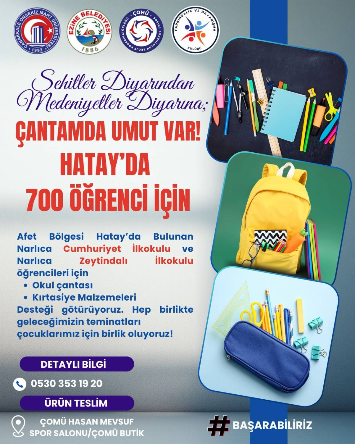 Çanakkale Onsekiz Mart Üniversitesi (ÇOMÜ), sosyal sorumluluk çalışmaları kapsamında deprem bölgesine yönelik destek projelerine bir yenisini daha ekliyor. ÇOMÜ Sosyal Sorumluluk Proje Koordinatörlüğü öncülüğünde, Ezine Belediyesi ve ÇOMÜ Farkındalık ve Dayanışma Kulübü iş birliğiyle hayata geçirilen “Şehitler Diyarından Medeniyetler Diyarına; Çantamda Umut Var!” projesi ile Hatay’da eğitim gören çocuklara yönelik kapsamlı bir dayanışma çalışması başlatılıyor.
