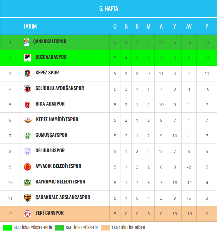 5 haftalık periyodun ardından Süper Amatör Lig’de puan durumu şu şekilde oluştu: