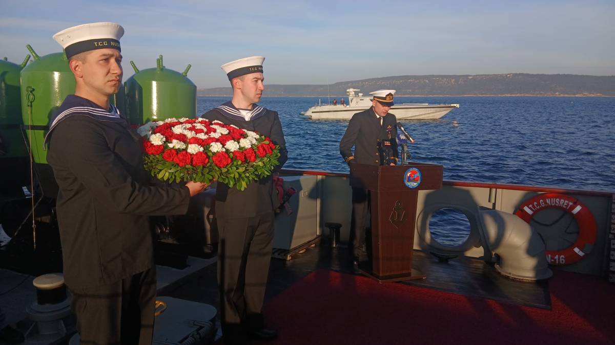 Çanakkale Deniz Müzesi Komutanlığı Yüzer İskelesi’nde demirli bulunan TCG Nusret (N-16), tarihe geçen mayın dökme rotasında sembolik bir seyir gerçekleştirdi. Tarihi anın canlandırıldığı etkinlikte gemide bulunan protokol üyelerine Nusret Mayın Gemisi’nin 111 yıl önceki görevini ve Çanakkale Deniz Savaşları’ndaki kritik rolünü anlatan video gösterimi sunuldu.