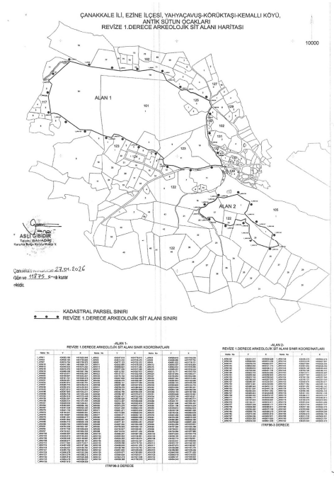 Kültür ve Turizm Bakanlığı’na bağlı Çanakkale Kültür Varlıklarını Koruma Bölge Kurulu, Ezine ilçesi sınırlarında yer alan Koçali Antik Sütun Ocakları ile ilgili önemli bir karar aldı. 27 Ocak 2026 tarihli toplantıda alınan karar doğrultusunda, Yahyaçavuş, Körüktaşı ve Kemallı köyleri sınırları içerisinde bulunan 1. derece arkeolojik sit alanlarının sınırları yeniden düzenlendi. Yeni düzenleme kapsamında hazırlanan revize sit haritasının uygun olduğuna karar verildi.