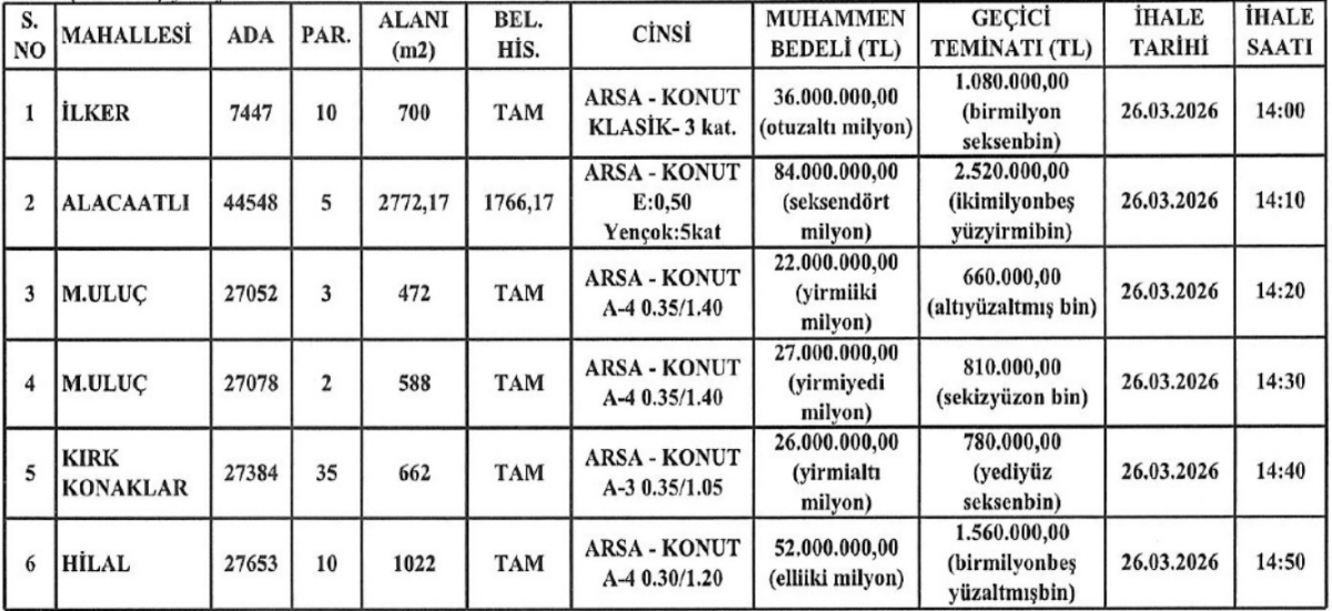 Satışa sunulan taşınmazların muhammen bedelleri 22 milyon TL ile 84 milyon TL arasında değişirken, geçici teminat tutarları 660 bin TL’den başlayıp 2 milyon 520 bin TL’ye kadar çıkıyor. İhaleler 26 Mart 2026 tarihinde belirlenen saatlerde yapılacak.
