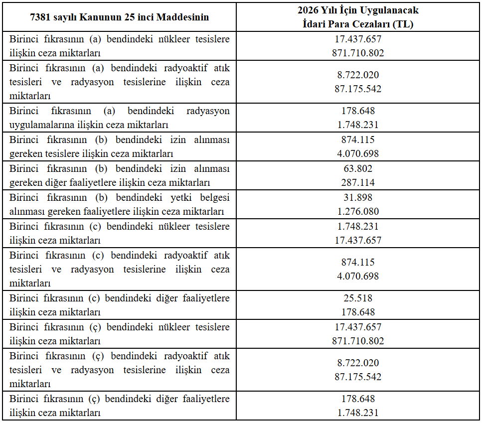 Bu oran doğrultusunda, nükleer düzenleme kapsamındaki tüm idari para cezaları artırılarak yeni tutarlar belirlendi.