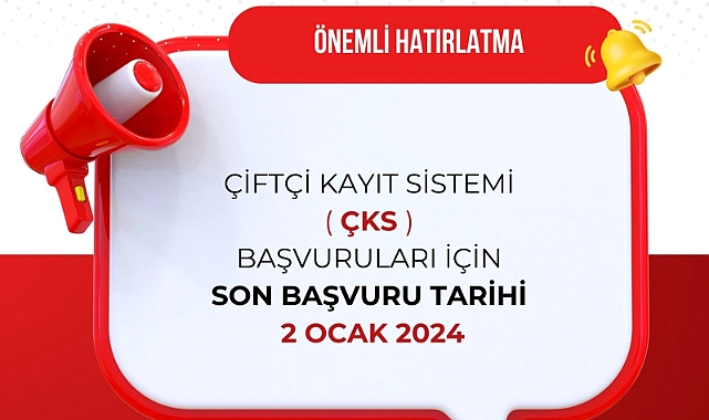 Tarım ve Ormancılık Bakanlığı tarafından, çiftçilere yönelik tarımsal faaliyetlerin kayıt altına alınması, tarımsal desteklemeler ve tarım politikalarını belirlenmesi, denetlenmesi ve izlenmesi amacıyla oluşturulmuş bir sistem olan Çiftçi Kayıt Sistemi için son başvuru günü uyarısı yapıldı. Çiftçiler, 2 Ocak 2024’e kadar ÇKS’ye başvurabilecekler.