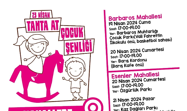 19 Nisan Cuma günü Barbaros Muhtarlığı Çocuk Parkı’nda ve 20 Nisan Cumartesi günü Barış Kordonu Barış Kafe’nin önünde Tahta At Çocuk Şenliği düzenlenecek.