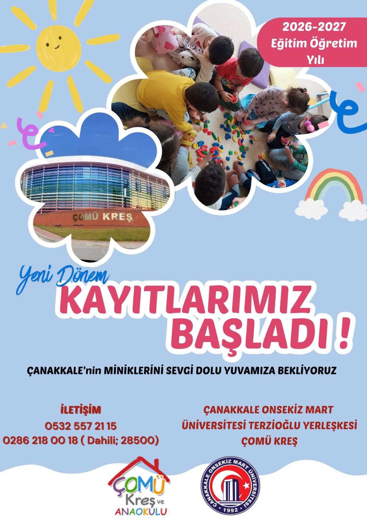 Çanakkale Onsekiz Mart Üniversitesi bünyesinde faaliyet gösteren ÇOMÜ Kreş ve Anaokulu, 2026-2027 eğitim öğretim yılı için yeni dönem kayıtlarının başladığını duyurdu. Üniversite yerleşkesi içerisinde hizmet veren kurum, okul öncesi eğitim alanında sunduğu modern eğitim yaklaşımı ve güvenli ortamıyla dikkat çekiyor.