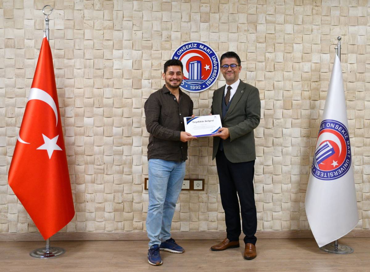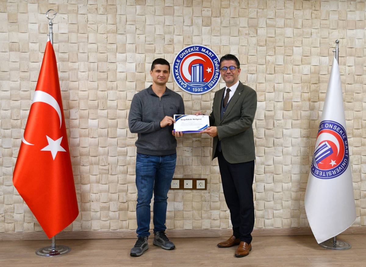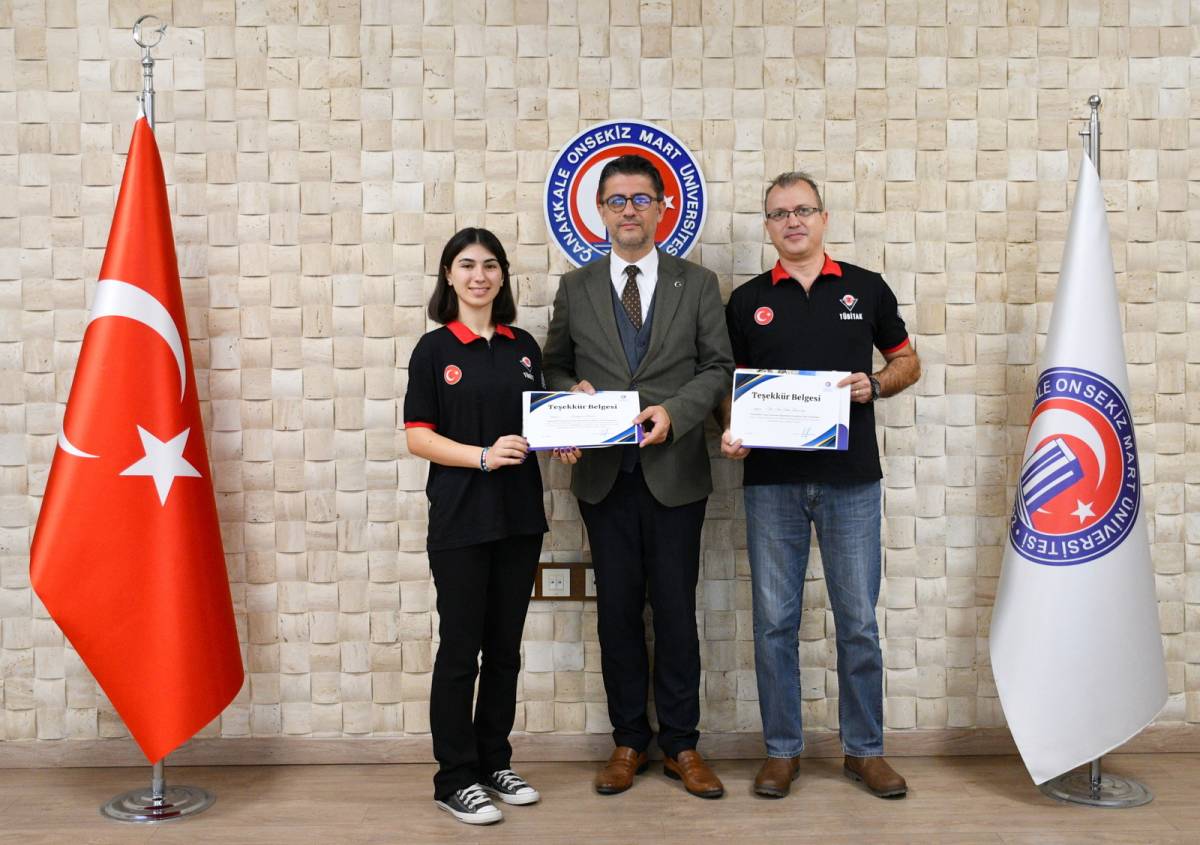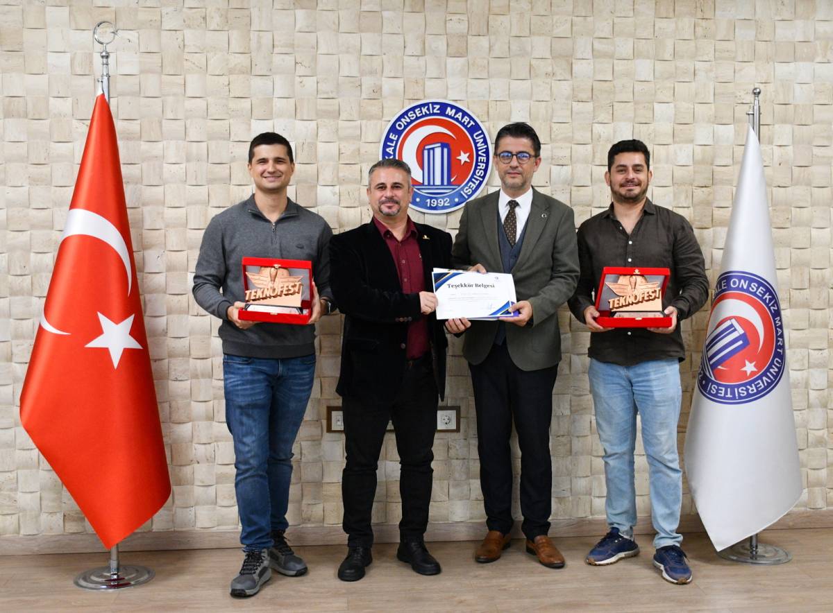 ÇOMÜ Rektörü Prof. Dr. R. Cüneyt Erenoğlu, TEKNOFEST’te ödül kazanan öğrencileri Rektörlük makamında ağırladı. Öğrencilerin başarılarını kutlayan Rektör Erenoğlu, teşekkür belgelerini takdim ederek, üniversitenin bilim, teknoloji ve girişimcilik vizyonuna katkıda bulunan bu değerli çalışmaları takdirle karşıladığını vurguladı.