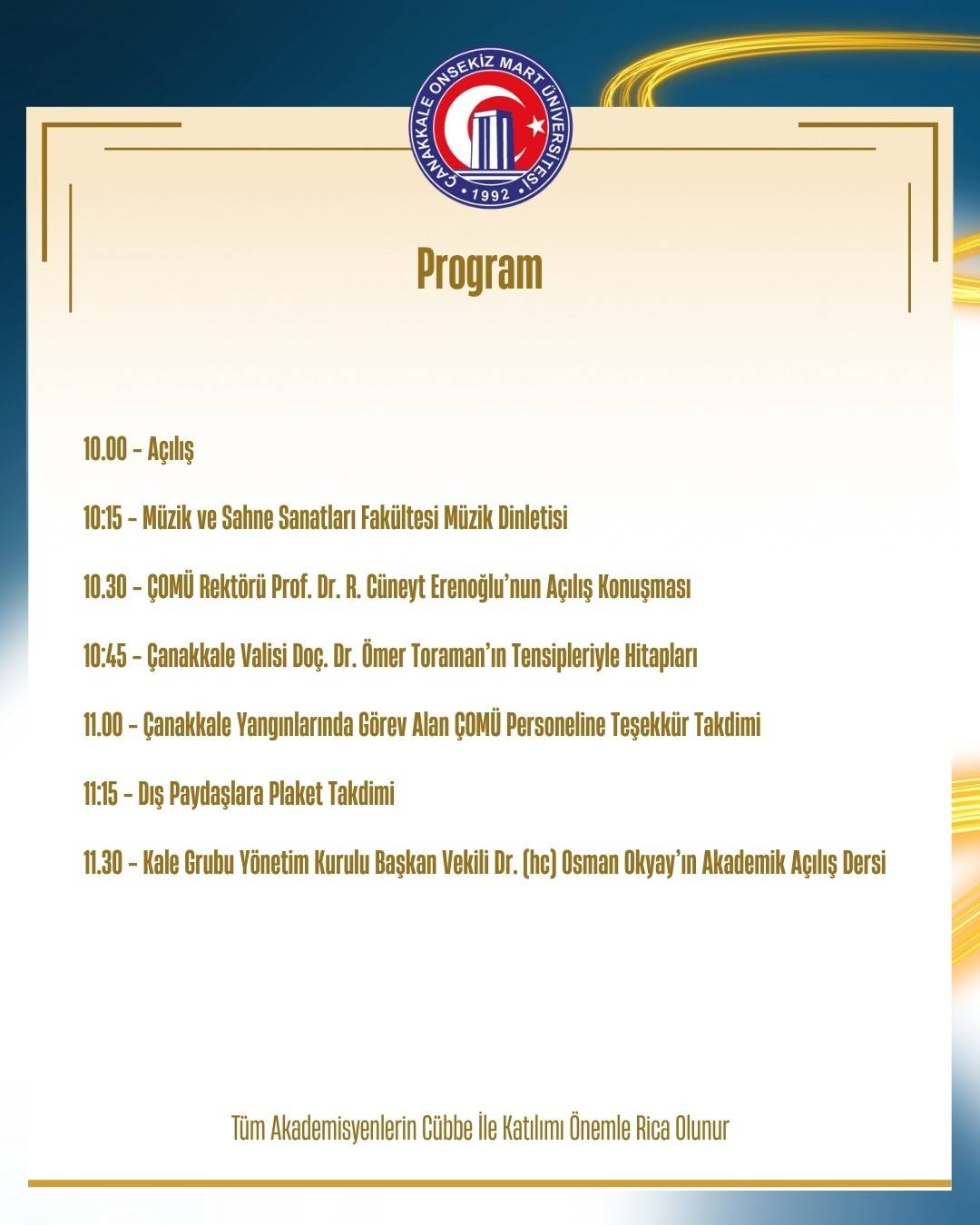 Çanakkale Onsekiz Mart Üniversitesi, tüm akademik ve idari personeli, öğrencileri ve paydaş kurumları 2025-2026 Akademik Yılı Açılış Töreni’ne davet etti.