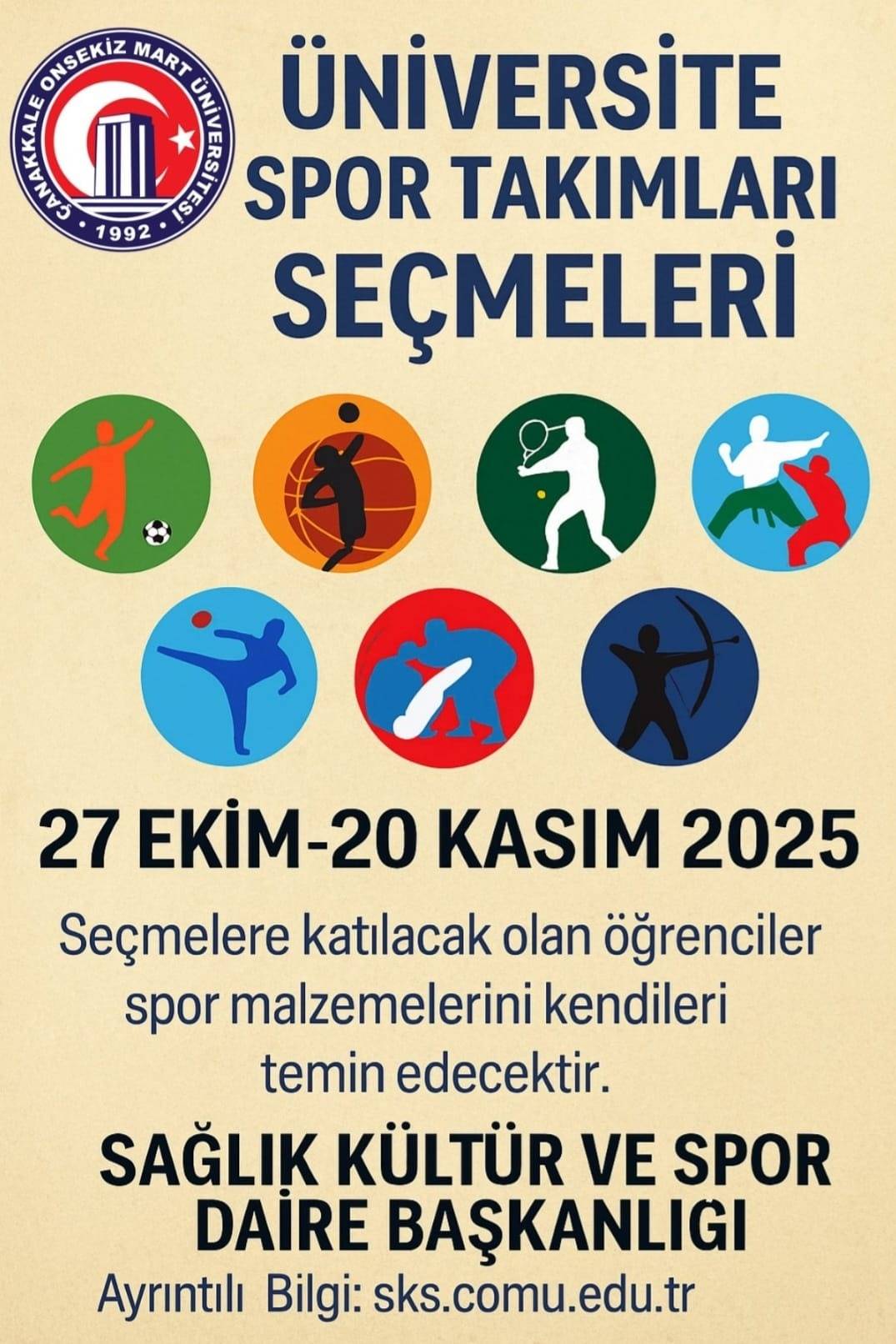 Çanakkale Onsekiz Mart Üniversitesi (ÇOMÜ), her yıl olduğu gibi bu yıl da spor alanında yetenekli öğrencilerini keşfetmek için yeni bir dönemin kapılarını aralıyor. Üniversite Spor Takımları Seçmeleri, 27 Ekim - 20 Kasım 2025 tarihleri arasında gerçekleştirilecek. Tüm öğrenciler için açık olan bu seçmelerde, öğrenciler hem fiziksel kapasitelerini hem de takım ruhlarını ortaya koyma fırsatı bulacak.