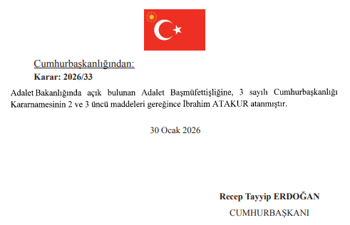 Cumhurbaşkanlığı tarafından alınan 2026/33 sayılı atama kararı, 31 Ocak 2026 tarihli Resmî Gazete’de yayımlanarak yürürlüğe girdi. Karar kapsamında, Adalet Bakanlığında açık bulunan Adalet Başmüfettişliği görevine İbrahim Atakur atandı. Cumhurbaşkanı Recep Tayyip Erdoğan’ın imzasını taşıyan karar, 3 sayılı Cumhurbaşkanlığı Kararnamesinin 2’nci ve 3’üncü maddeleri uyarınca gerçekleştirildi. Atama, Adalet Bakanlığı teşkilat yapısı içinde önemli görevlerden biri olan başmüfettişlik makamına ilişkin düzenlemeyi içeriyor.
