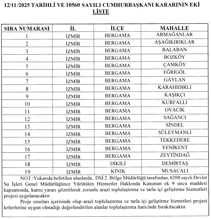Cumhurbaşkanı Recep Tayyip Erdoğan, 13 Kasım 2025 tarihli Resmî Gazete’de yayımlanan kararla İzmir ilinde arazi toplulaştırma ve tarla içi geliştirme hizmetlerinin yapılmasına onay verdi. Karar, 6200 sayılı Devlet Su İşleri Genel Müdürlüğü (DSİ) Kanunu’nun ek 9. maddesi uyarınca alınırken, uygulamanın belirlenen ekli listede yer alan alanlarda yürütüleceği bildirildi.