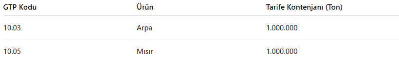 Karara göre, Gümrük Tarife Pozisyonu (GTP) numaraları 10.03 (arpa) ve 10.05 (mısır) kapsamında bulunan ürünlerde 1.000.000 tonluk tarife kontenjanı uygulanacak. Düzenleme, yayımlandığı tarih itibarıyla yürürlüğe girdi.