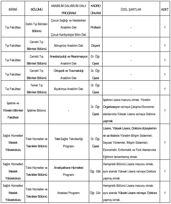 İlanda belirtilen fakülte, bölüm ve anabilim dalları ile kadro detayları şöyle: