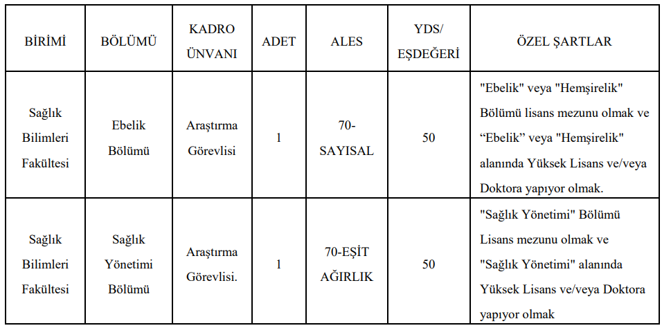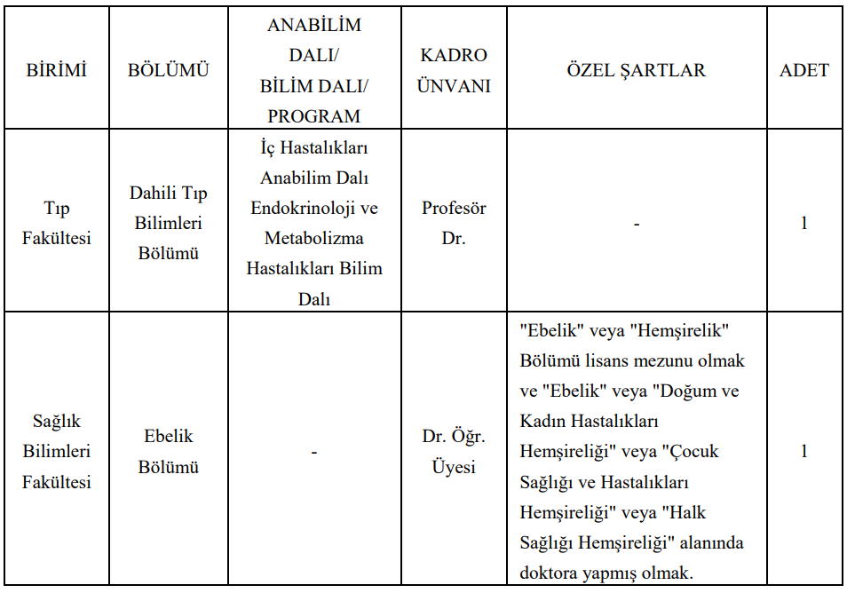 Adayların “Ebelik” veya “Hemşirelik” lisans mezunu olmaları ve “Ebelik”, “Doğum ve Kadın Hastalıkları Hemşireliği”, “Çocuk Sağlığı ve Hastalıkları Hemşireliği” veya “Halk Sağlığı Hemşireliği” alanlarından birinde doktora yapmış olmaları gerekiyor.