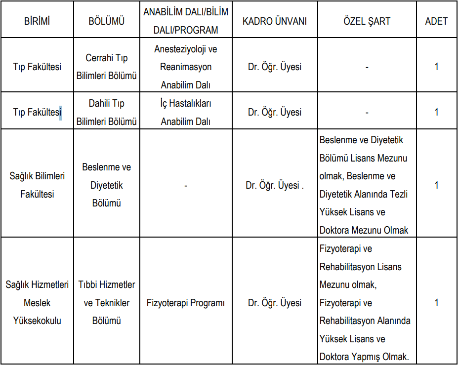 Başvurular, ilanın Resmî Gazete’de yayınlanmasından itibaren 15 gün içinde Rektörlük Personel Daire Başkanlığına yapılacak.