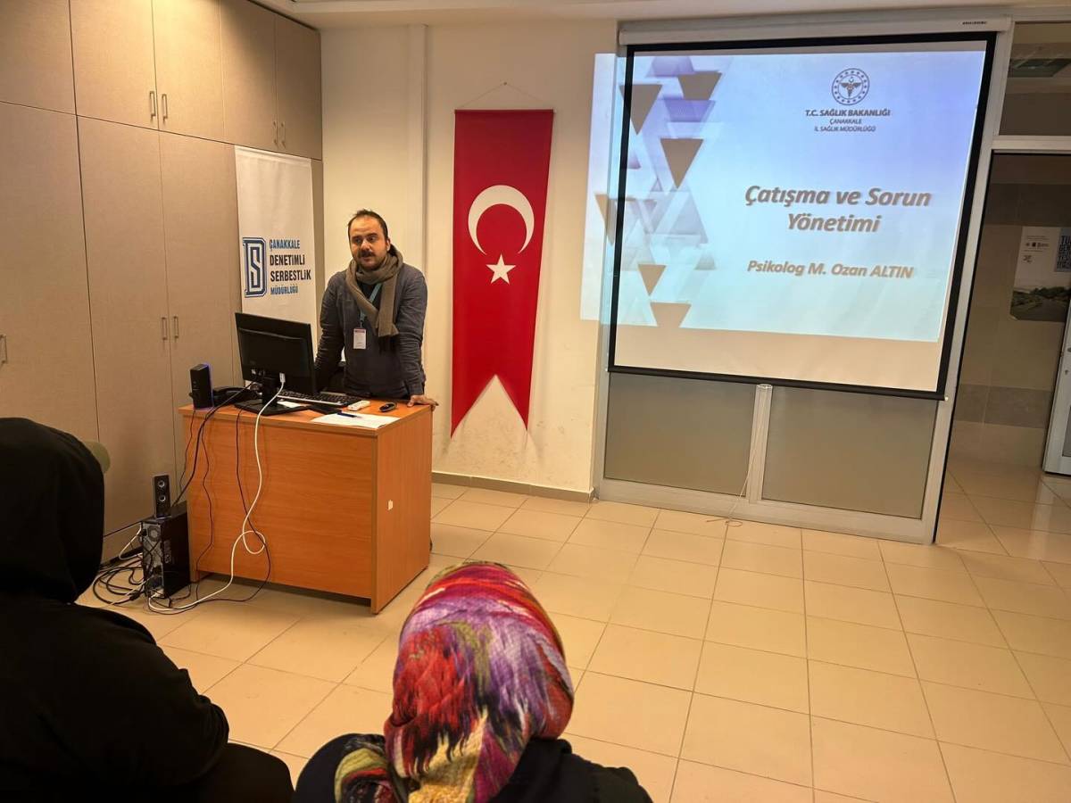 Seminer, Çanakkale İl Sağlık Müdürlüğü Halk Sağlığı Hizmetleri Başkanlığı Bulaşıcı Olmayan Hastalıklar Biriminde görev yapan psikolog Ozan Altın tarafından verildi. Eğitimde, çatışmanın nedenleri, stresle baş etme yöntemleri, etkili iletişim ve sorun çözme becerileri ele alındı.