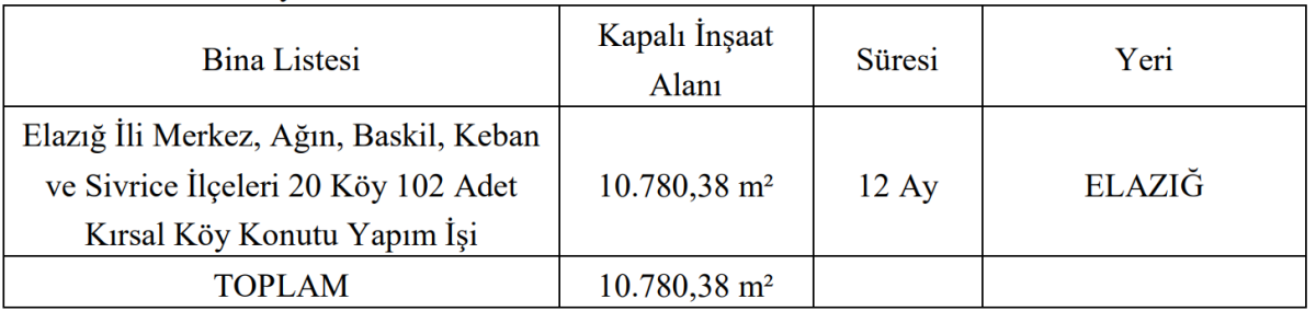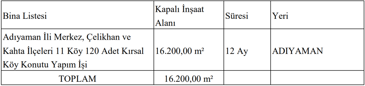 İhaleye konu olan projelerden ilki Adıyaman’da gerçekleştirilecek. Merkez, Çelikhan ve Kahta ilçelerine bağlı 11 köyde toplam 120 adet kırsal konut inşa edilecek. Bu projenin toplam kapalı alanı 16.200 metrekare olarak açıklandı.