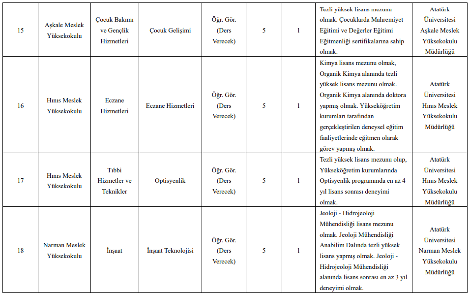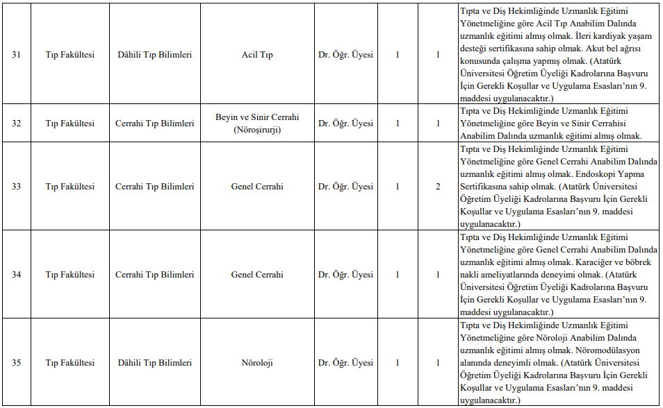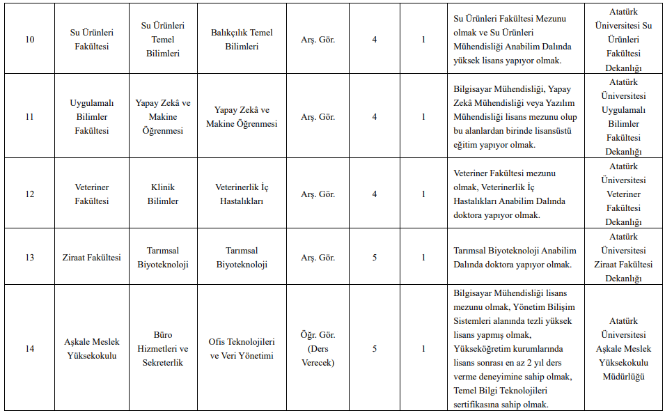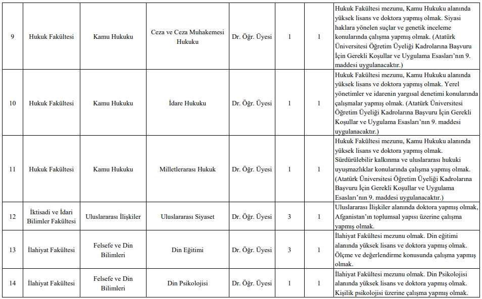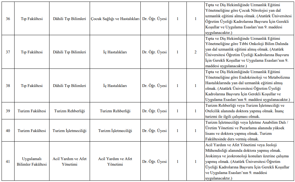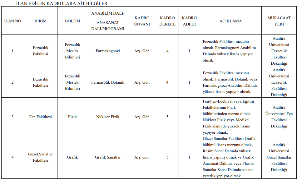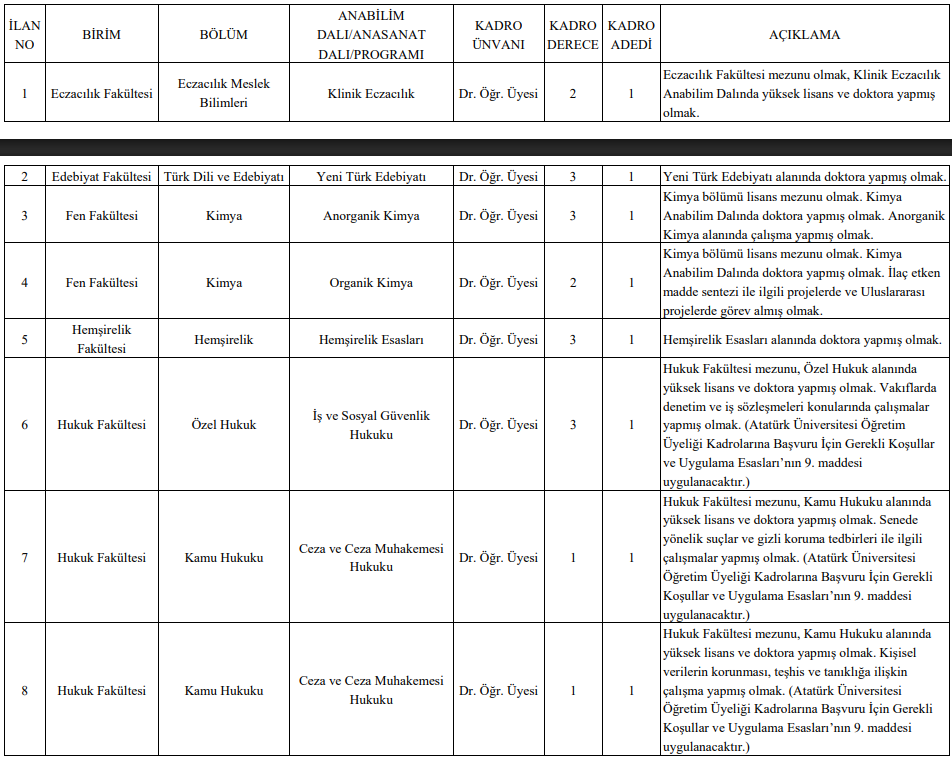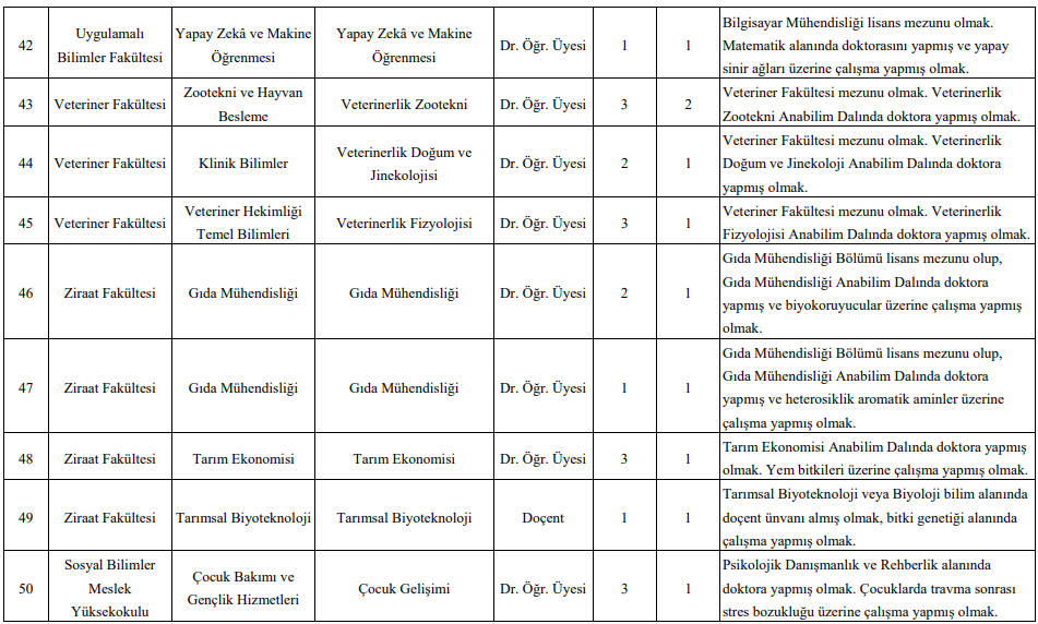 İlana göre; Eczacılık, Edebiyat, Fen, Hukuk, İktisadi ve İdari Bilimler, İlahiyat, Eğitim, Mimarlık ve Tasarım, Mühendislik, Sağlık Bilimleri, Tıp, Veteriner, Ziraat ve Turizm Fakülteleri dahil olmak üzere çok sayıda akademik birimde toplam 50 öğretim üyesi kadrosu açıldı.