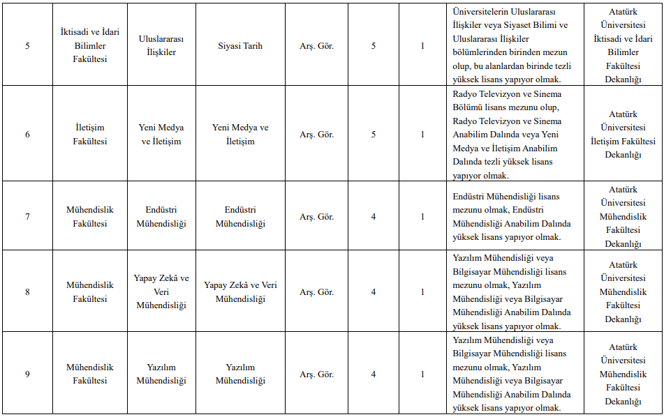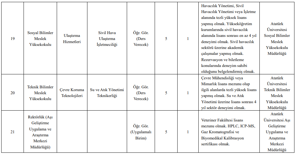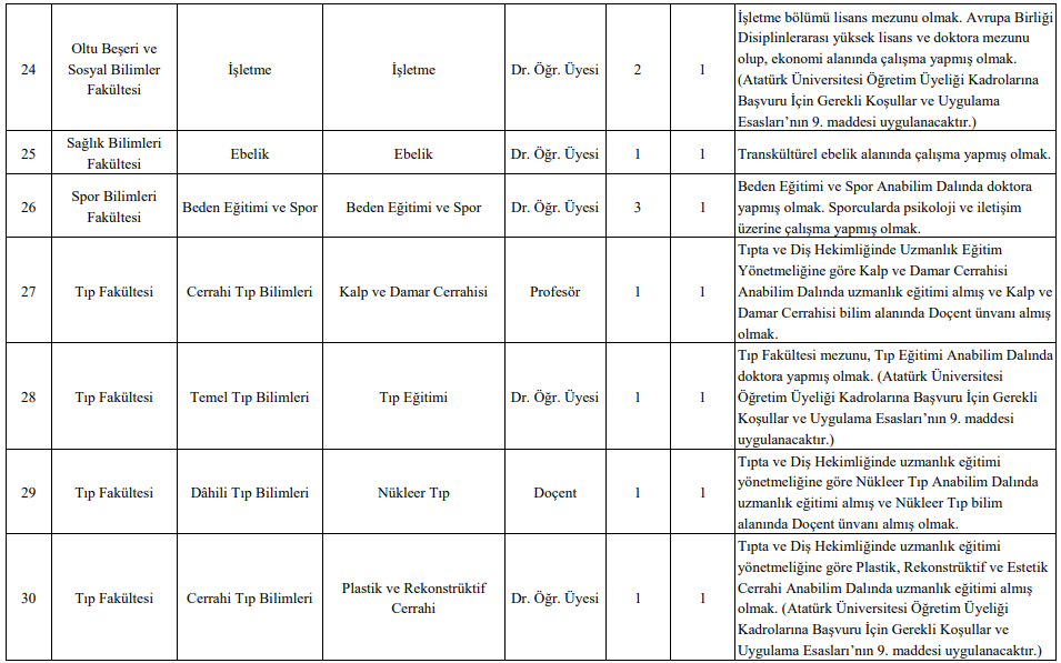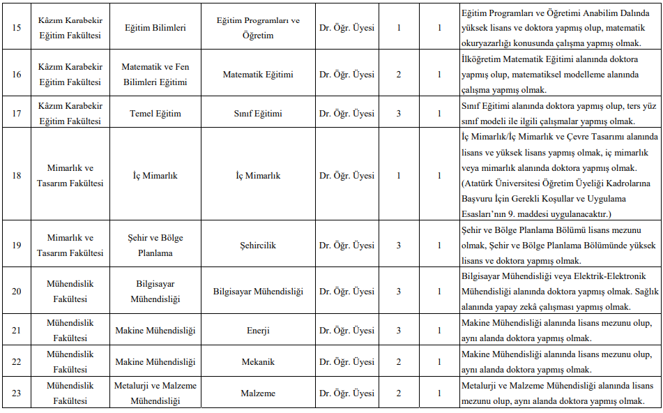 Atatürk Üniversitesi Rektörlüğü, üniversite birimlerinde istihdam edilmek üzere profesör, doçent ve doktor öğretim üyesi alımı gerçekleştireceğini duyurdu. Başvurular, 2547 sayılı Kanun ile Üniversitenin Öğretim Üyeliği Kadrolarına Başvuru İçin Gerekli Koşullar ve Uygulama Esasları kapsamında değerlendirilecek.