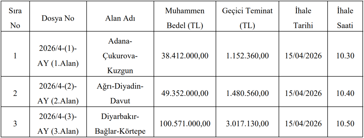 İhale tarihi 15 Nisan 2026 olarak açıklandı. Aynı gün içerisinde üç farklı ihale gerçekleştirilecek: