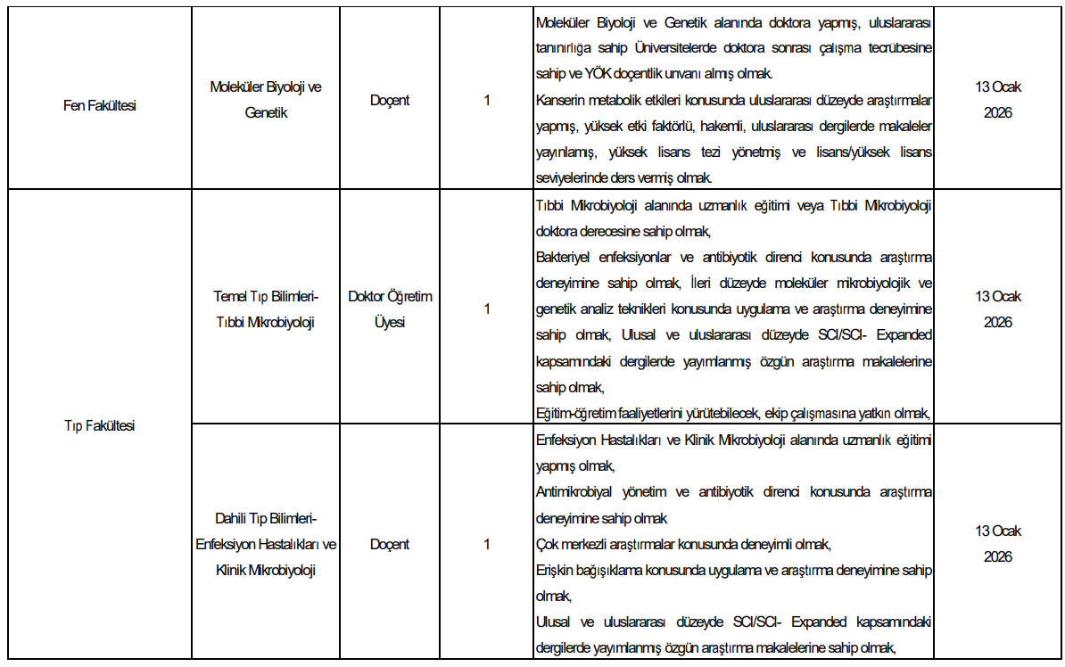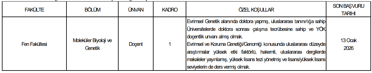 Fen Fakültesi Moleküler Biyoloji ve Genetik Bölümü için iki ayrı doçent kadrosu ilan edildi. Bu kadrolar;