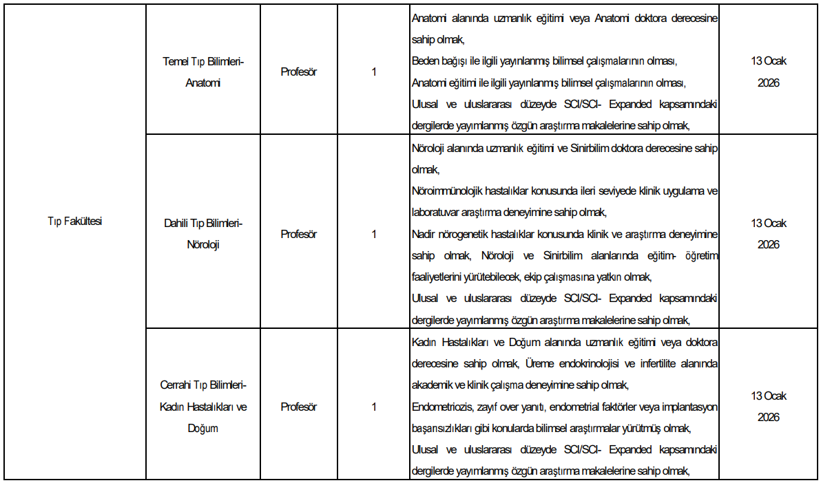 kadroları dikkat çekiyor. Özellikle antibiyotik direnci, nöroimmünolojik hastalıklar, nadir nörogenetik hastalıklar ve üreme endokrinolojisi gibi alanlarda uzmanlığa sahip akademisyenler için önemli fırsatlar sunuluyor.