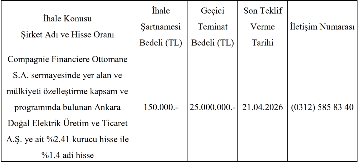 İhale kapsamında, Ankara Doğal Elektrik Üretim ve Ticaret A.Ş.’nin, Compagnie Financiere Ottomane S.A. sermayesinde bulunan hisseleri satışa çıkarıldı.