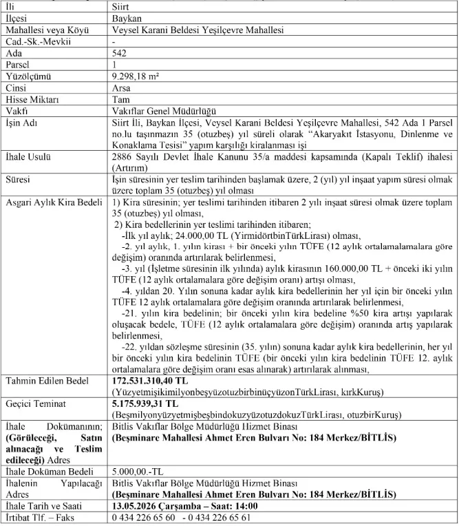 En dikkat çekici ilanlardan biri ise Bitlis Vakıflar Bölge Müdürlüğü tarafından duyuruldu. Siirt’in Baykan ilçesinde bulunan yaklaşık 9.298 metrekarelik taşınmaz, 35 yıl süreyle kiraya verilecek.