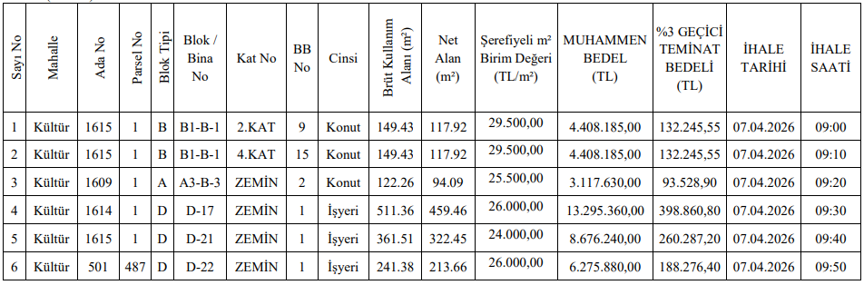 Fiyatlar 4 milyon TL’den başlayıp 34,5 milyon TL’ye kadar yükseliyor. İhaleler 15 Nisan 2026 tarihinde gerçekleştirilecek.
