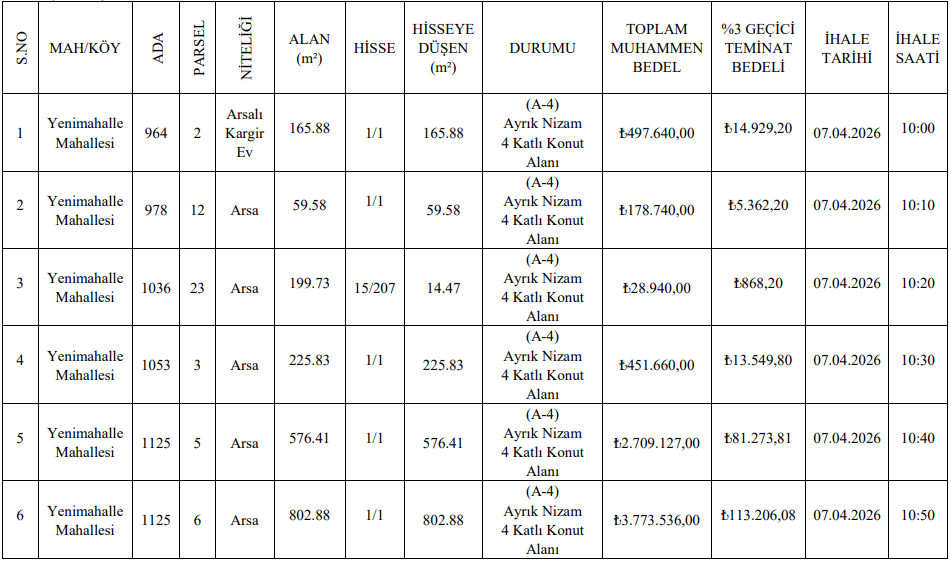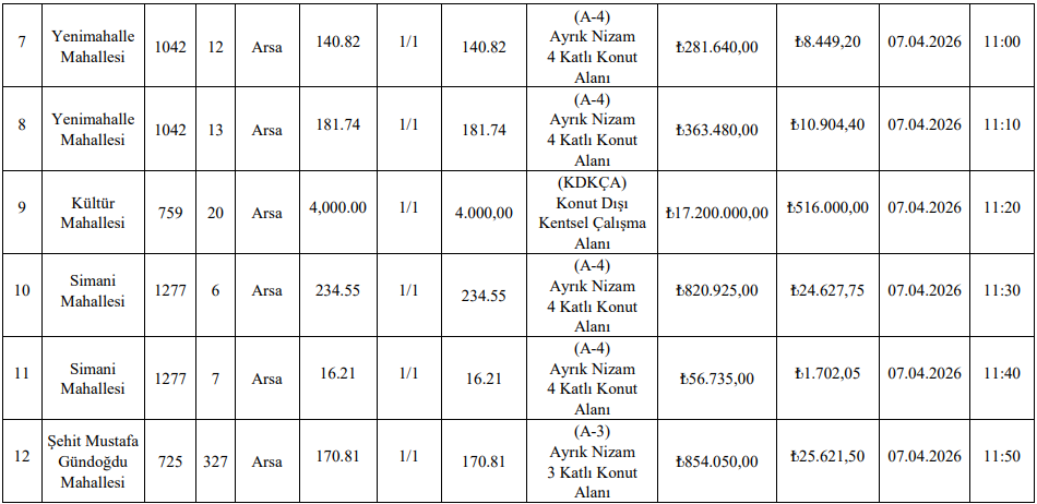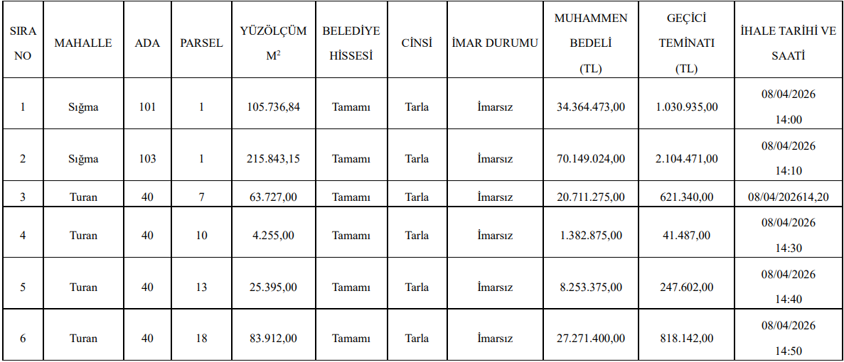 Bunun yanı sıra daha küçük metrekareli konut arsaları ve biyogaz tesis alanı olarak planlanan büyük bir parsel de yatırımcıların ilgisine sunuldu. İhale tarihi 8 Nisan 2026 olarak duyuruldu.