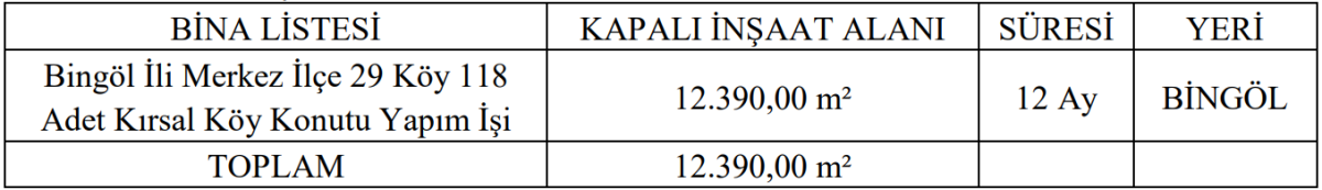 Bingöl merkez ilçeye bağlı 29 köyde toplam 118 adet kırsal konut inşa edilecek. Toplamda 12.390 metrekare kapalı alana sahip olacak proje, 12 ay içerisinde tamamlanacak. İhale, Dünya Bankası satın alma kuralları çerçevesinde ulusal rekabetçi yöntemle gerçekleştirilecek.