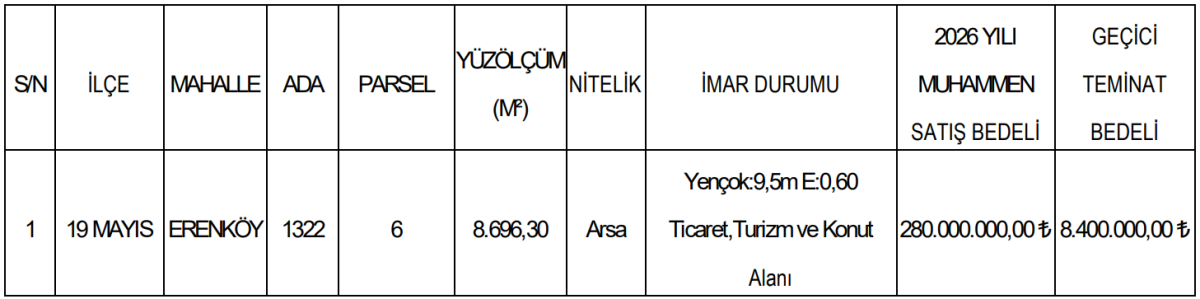 Ticaret, turizm ve konut alanı imarına sahip olan taşınmaz için ihale, 9 Nisan 2026 saat 14:00’te kapalı teklif usulüyle gerçekleştirilecek. Geçici teminat bedeli ise 8,4 milyon TL olarak açıklandı.
