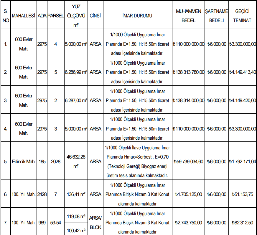 Satışa sunulan arsaların büyüklükleri 5.000 metrekare ile 6.287 metrekare arasında değişirken, muhammen bedeller 110 milyon TL ile 138 milyon TL arasında yer alıyor.