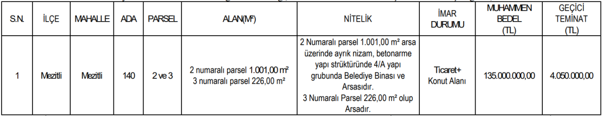 Mersin’de ise MESKİ Genel Müdürlüğü tarafından Mezitli ilçesinde bulunan taşınmazlar için ihale düzenlenecek. Ticaret ve konut alanı imarına sahip parseller için belirlenen muhammen bedel 135 milyon TL olarak açıklandı.
