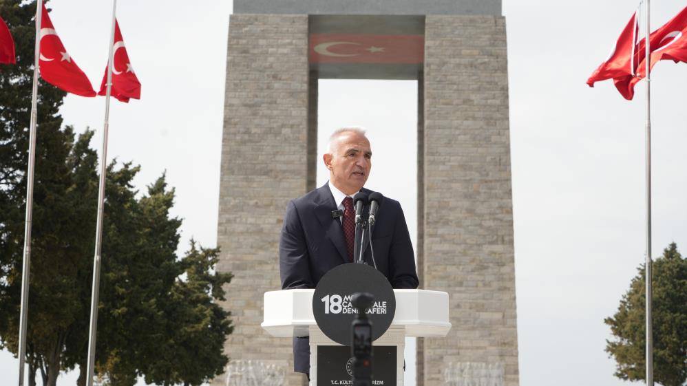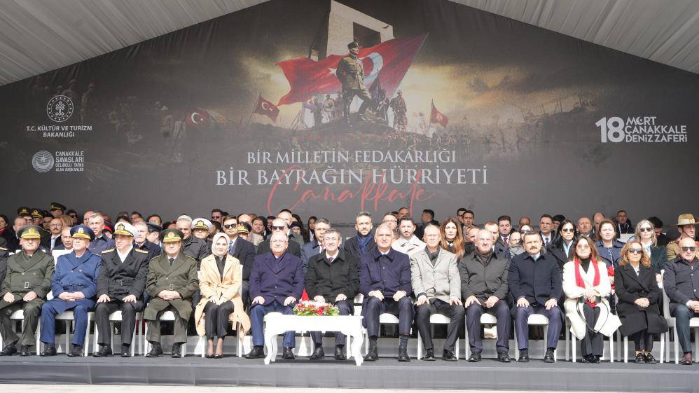 Kültür ve Turizm Bakanı Mehmet Nuri Ersoy yaptığı konuşmada, "Her sahada tarihin akışını değiştiren pek çok eylemin, olayın, çalışmanın, eser ve buluşun banisi olan Türk milleti, istiklal ve istikbali söz konusu olduğunda, vatanına ve bayrağına göz dikildiğinde savaş meydanında da tarihin akışını değiştirmeye; coğrafyaları ve devletleri şekillendirmeye daima muktedir olmuştur. Ordinaryüs Profesör Fritz Neumark bu gerçeği 'Tarihten Türkleri çıkarırsanız ortada tarih diye bir şey kalmaz' diyerek dile getirmiştir. Unutanların hafızasına, 20'nci yüzyılda bir kez daha bu gerçeği mıh gibi çaktığımız yerdir Çanakkale. Vatan söz konusu olduğunda yokluğu ve yoksunluğu umursamayan, tereddüt etmeyen, vazgeçmeyenlerin canlarıyla, kanlarıyla, tertemiz imanlarıyla çizdiği geçilemez sınırdır bu topraklar. 18 Mart'ın, Çanakkale Deniz Zaferi olarak anılmasında saklı olan muazzam başarının altını burada özellikle bir kez daha çizmek isterim. Çünkü deniz zaferleri iki donanma arasındaki çarpışmalarda kazanan tarafa atfedilen başarıdır. Hâlbuki Boğazı ve çevresini savunan Türk ordusu; 2. Ağır Topçu Tugayı, Erenköy Ağır Topçu Bölge Komutanlığı ile 9. ve 11. Piyade tümenlerinden oluşuyordu. Herhangi bir donanma gücü söz konusu değildi. Buna karşı işgal kuvvetleri ise tarihin o zamana kadar gördüğü en büyük donanma gücüyle Çanakkale'ye hücum ediyordu. Mehmet Akif'in 'Tepeden yol bularak geçmek için Marmara'ya / Kaç donanmayla sarılmış ufacık bir karaya' mısralarının ardında, taraflar arasındaki bu muazzam fark yatmaktadır. İşgal kuvvetlerinin 3 tümenden oluşan birleşik filosunda; Queen Elizabeth, Agamemnon, Inflexible, Ocean, Irresistible, Bouvet ve Majestic gibi İngiliz ve Fransız donamalarının en güçlü 18 savaş gemisi yer alıyordu. Sadece bu gemilerdeki toplam top sayısı 279'du. Bunların yanında hafif kruvazörler, denizaltılar, mayın gemileri, kömür ve hastane gemileri ve hatta 6 uçak taşıyan ARK Royal uçak gemisi de Çanakkale'ye gelmiştir. Peki, bizde? Bizde Cevat Paşa vardı saygıdeğer misafirler. Hafız Nazmi ve Tophaneli Hakkı beyler, Üsteğmen Hasan ve Teğmen Mevsuf, Seyit ve Müstecip onbaşılar vardı bizde… Bu adlarda saklı, iman dolu sinesi savaş gemilerinin zırhından daha kalın, daha dayanıklı niceleri vardı Çanakkale'de. Karşılarındaki donamanın inanılmaz büyüklüğüne, kıyamet gibi yağan ateş gücüne aldırmadılar. Üzerine bastıkları, arkalarında uzayıp giden vatan toprağına baktılar ve geri dönmeyi akıllarından çıkarıp yüzlerini denize çevirdiler. Kulağa hayali, efsanevi gibi geliyor ama yaşandı bunlar… Şahidi, Çanakkale sularına gömülen Bouvet, Irresistible ve Ocean gemileridir. Şahit, yenilmez diye anılırken batanlar dışında 4 gemisi de savaş dışı kalan; insan zaiyatı 800'ü aşan ve gücünün üçte birini kaybeden birleşik filodur. Hatırlatmak isterim ki müttefikler Boğazı kolayca geçeceklerini düşünüyordu. Churchill'e göre İngiliz donanması Boğaz'da görününce Türkler topları bırakıp kaçacaktı. Hatta o kadar emindiler ki İngiliz Cook Seyahat Şirketi İstanbul'a tur bile organize etmişti. İşte, gönderdikleri filodan bile büyük bu kibirleri de Çanakkale'nin şehit ve gazi kanlarıyla bereketlenmiş sularında boğulup gitmiştir. O gün birleşik filonun bir deniz yüzbaşısı 'Doğrudur, yumurta kırılmadan omlet yapılamaz ama yumurtalar kırılır ve omlet yapılmazsa kötü olur. Mesele şudur: Tabyalara üç gemi değerinde hasar verdik mi' diyerek meselenin özünü dile getirmiştir. Ecdadımız, kimsenin gücü yetmez denilen bu filoya fazlasıyla yetmiş ve dahi artmışlardır ki sonrasında karadan işgale yeltenenlere; vatana, bayrağa, mukaddesata göz dikip el uzatanlara da hadlerini bildirmişlerdir. O zaman da Bigalı Mehmet Çavuş, Yüzbaşı Yusuf Kenan ve Kemal Beyler, Yarbay Hüseyin Avni Bey gibi cümle şehit ve gazilerimizin yiğitliğini simgeleyen yeni kahramanlar meydanda yerini almıştır. Ve kara savaşlarında bir direniş destanı yazan Anafartalar Kahramanı Yarbay Mustafa Kemal de Türk'ün istiklal ve istikbal mücadelesinin başkomutanı ve Cumhuriyetimizin kurucusu Gazi Mustafa Kemal Atatürk olarak tarihe geçmiştir. 111 yıl önce yazdığımız bu destanın zamansız bir zafer, değeri asla azalmayacak bir örnek olduğunu günümüzde tekrar tekrar tecrübe ediyoruz. Bugün uluslararası hukukun hiçe sayıldığı, vicdanların ayaklar altına alındığı, zevk olsun diye bombalama yapılabileceğinin hayasızca dillendirildiği bir dönemdeyiz. Bizler, 111 yıl önce ecdadımızın ispat ve ilan ettiği gibi güçlünün değil haklının galip geleceğini, kibrin değil sabır ve tevazuya sırtını vermiş cesaretin zafere ulaşacağını dünyaya buradan bir kez daha ilan ediyoruz. Konuşmamı bu duygularla noktalarken aziz Türk milletinin Çanakkale sularına yazdığı destanın, şanlı deniz zaferimizin 111'inci yıl dönümünü kutluyorum. Başta Çanakkale şehitlerimiz ve ahirete irtihal etmiş gazilerimiz olmak üzere Türk milletinin varlığı ve mukaddesatı için canını vermiş, kanını dökmüş, ömrünü vakfetmiş cümle geçmişlerimizi; Kurtuluş Savaşımızın Başkomutanı ve Cumhuriyetimizin kurucusu Gazi Mustafa Kemal Atatürk ve silah arkadaşlarını rahmetle, minnetle ve saygıyla anıyorum. Bu vesileyle şehit ailelerimizin, gazilerimizin ve aziz milletimizin mübarek Ramazan Bayramı'nı da tebrik ediyor, hepinize saygılar sunuyorum" dedi.