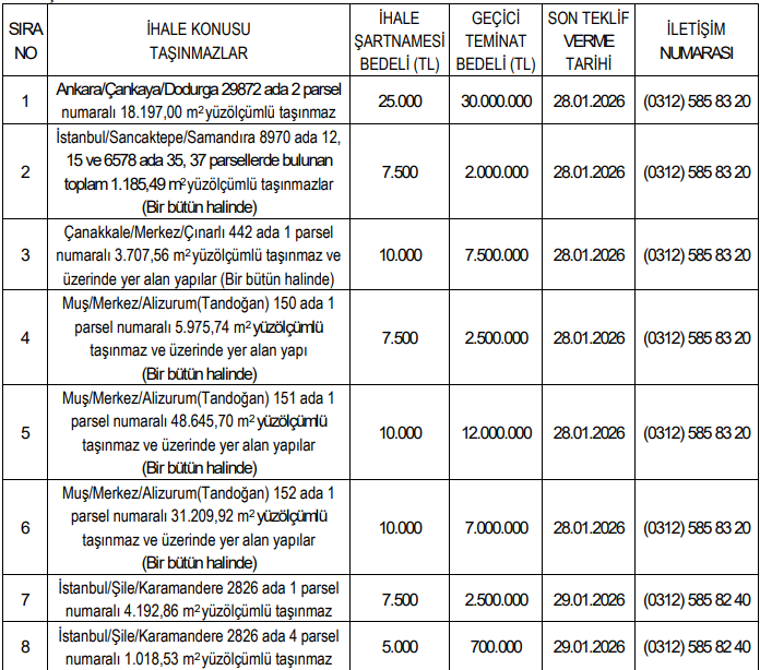 Ankara, İstanbul Sancaktepe, Çanakkale ve Muş’taki taşınmazlar için son teklif verme tarihi 28 Ocak 2026 olarak belirlendi. İstanbul Şile’de yer alan iki taşınmaz için ise teklifler 29 Ocak 2026 tarihine kadar kabul edilecek. Tüm teklifler, Özelleştirme İdaresi Başkanlığı’nın Ankara’daki merkez adresine elden teslim edilecek.