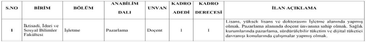 ATÜ’nün yayımladığı ilana göre, Pazarlama Anabilim Dalı Doçent kadrosuna başvuracak adaylarda aranacak özel şartlar şu şekilde sıralandı: