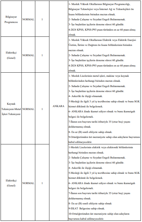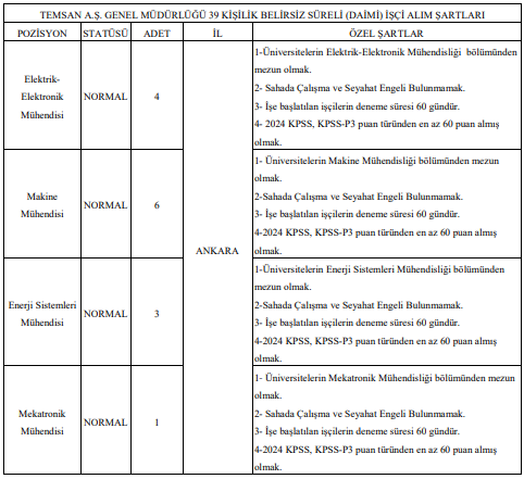 TEMSAN, Ankara ve Diyarbakır illerinde görevlendirilmek üzere aşağıdaki kadrolara personel alımı gerçekleştirecek: