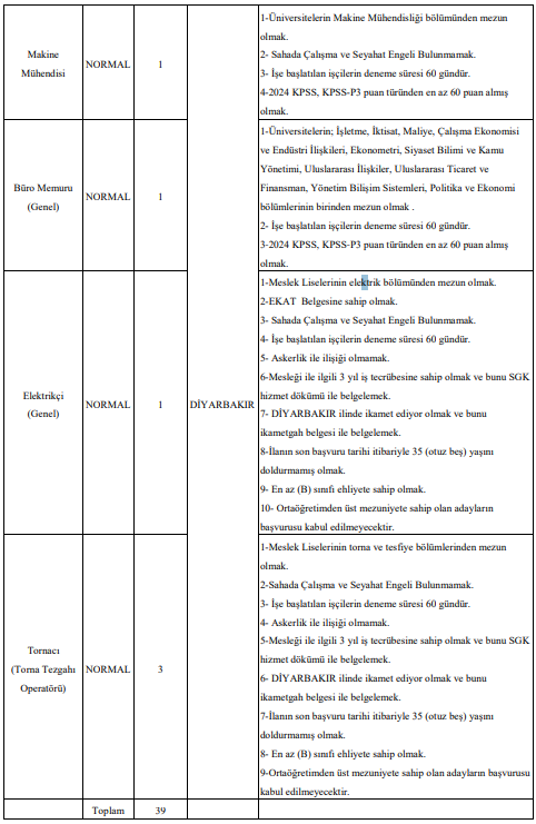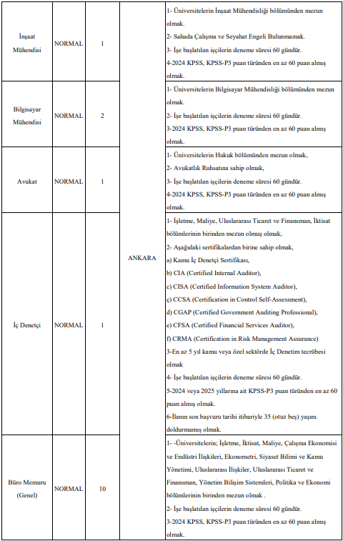 Tüm mühendis kadroları için 2024 KPSS P3 puan türünden en az 60 puan şartı aranıyor. Ayrıca adayların sahada çalışmaya ve seyahate engel durumlarının bulunmaması gerekiyor.