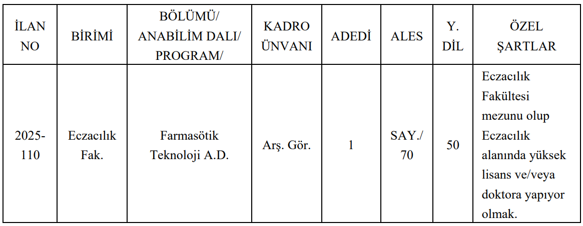 • Araştırma Görevlisi – Farmasötik Teknoloji ABD (1 adet)