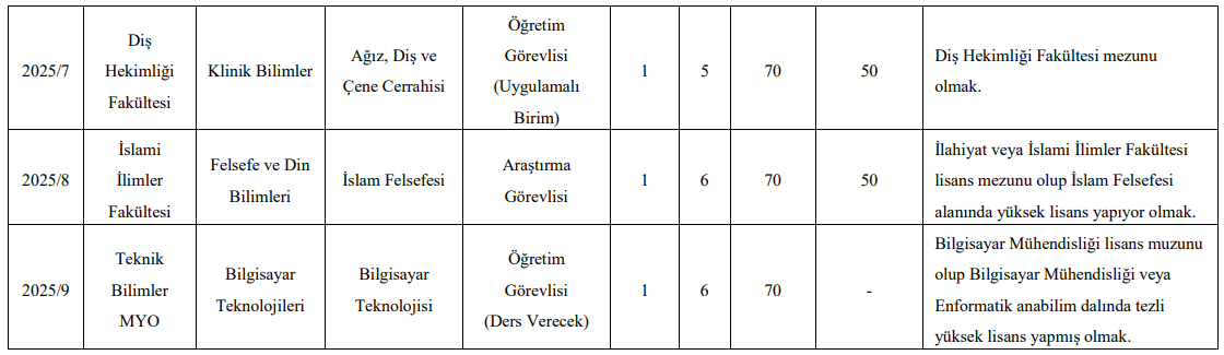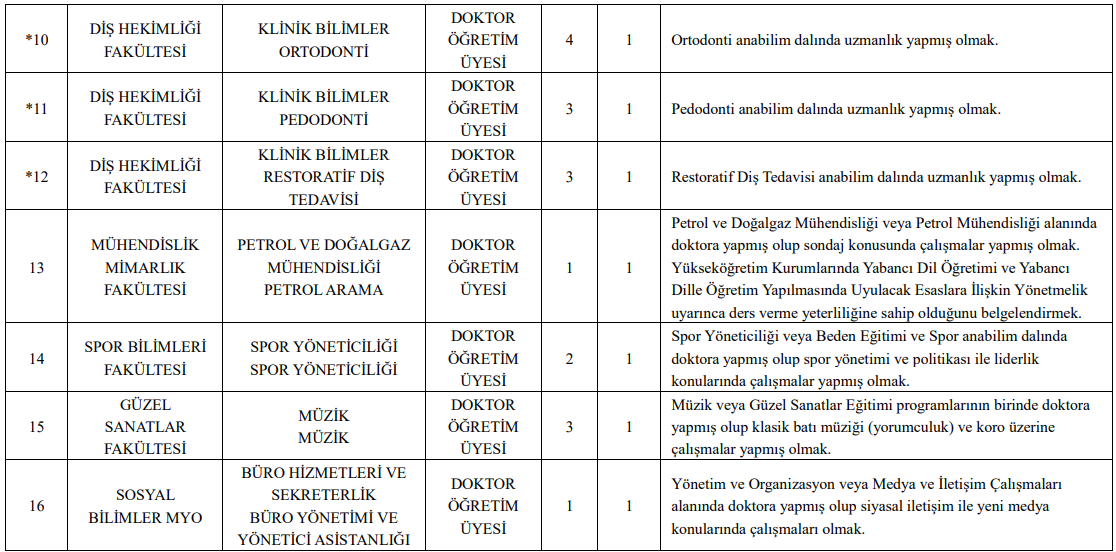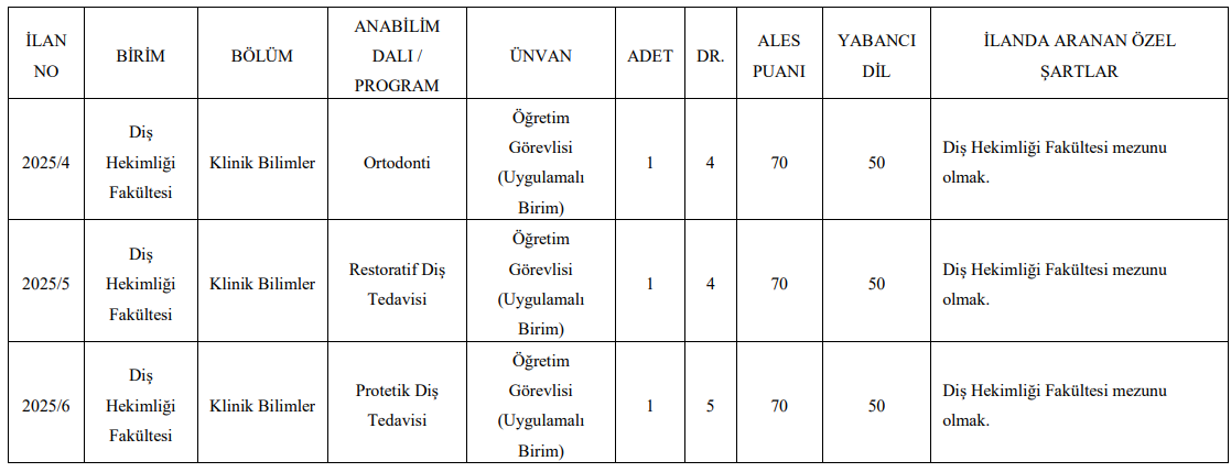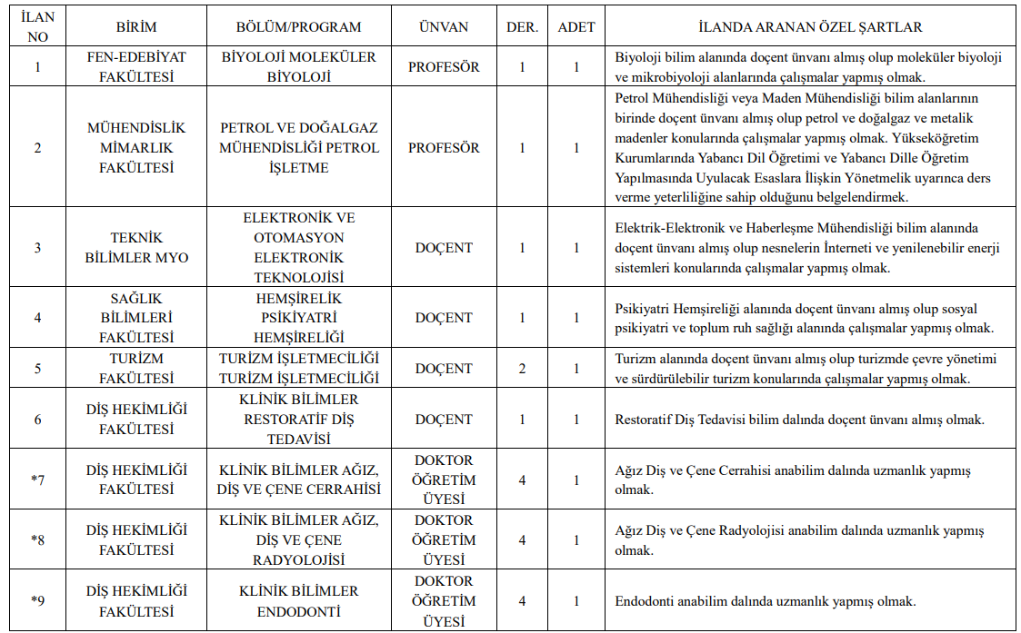 Özellikle Diş Hekimliği Fakültesi için açılan çok sayıda kadro, sağlık alanında akademik kariyer yapmak isteyenler için önemli bir fırsat sunuyor. Bunun yanı sıra petrol ve doğalgaz mühendisliği, biyoloji, elektronik, hemşirelik, spor yöneticiliği ve müzik gibi farklı alanlarda da alımlar yapılacak.