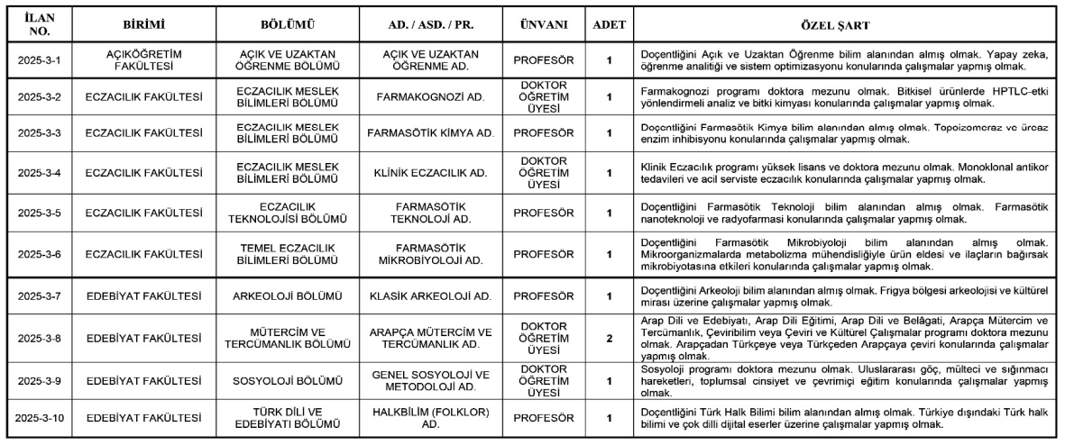 Ayrıca, ilanda belirtilen genel ve özel şartlar ile Anadolu Üniversitesi’nin atama ölçütlerini taşımadığı tespit edilen adayların başvuruları geçersiz sayılacak.