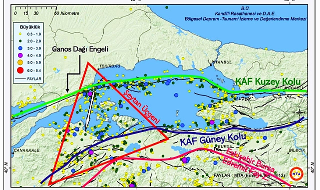 Denizdeki faylar kara yönünde enerji transferi yapamayınca, enerji beyaz ok ile işaretlendiği gibi Marmara Adası ve Biga dolayına mı yöneliyor?