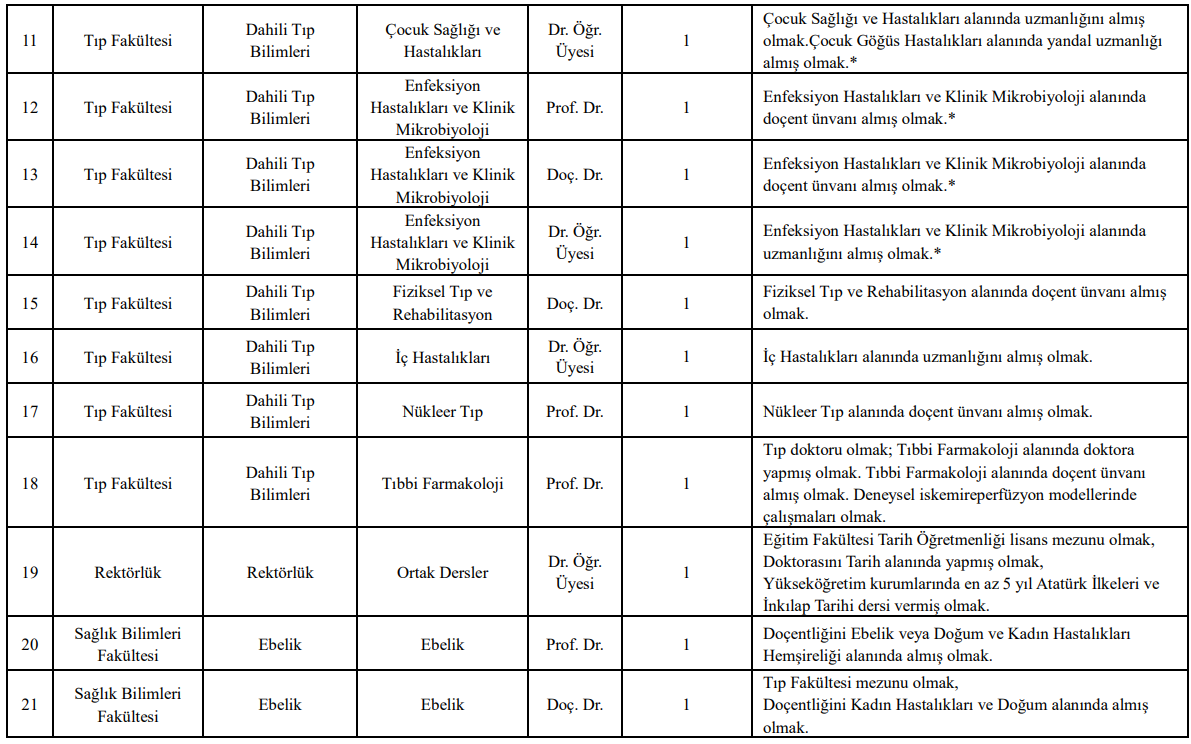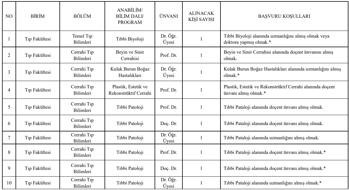 İlanın en geniş bölümünü Tıp Fakültesi kadroları oluşturuyor. Temel Tıp Bilimleri, Cerrahi Tıp Bilimleri ve Dahili Tıp Bilimleri alanlarında çok sayıda akademik personel alınacak. Tıbbi Biyoloji, Beyin ve Sinir Cerrahisi, Kulak Burun Boğaz Hastalıkları, Plastik ve Rekonstrüktif Cerrahi, Tıbbi Patoloji, Çocuk Sağlığı ve Hastalıkları, Enfeksiyon Hastalıkları, Fiziksel Tıp ve Rehabilitasyon, İç Hastalıkları, Nükleer Tıp ve Tıbbi Farmakoloji ilan edilen alanlar arasında yer alıyor.