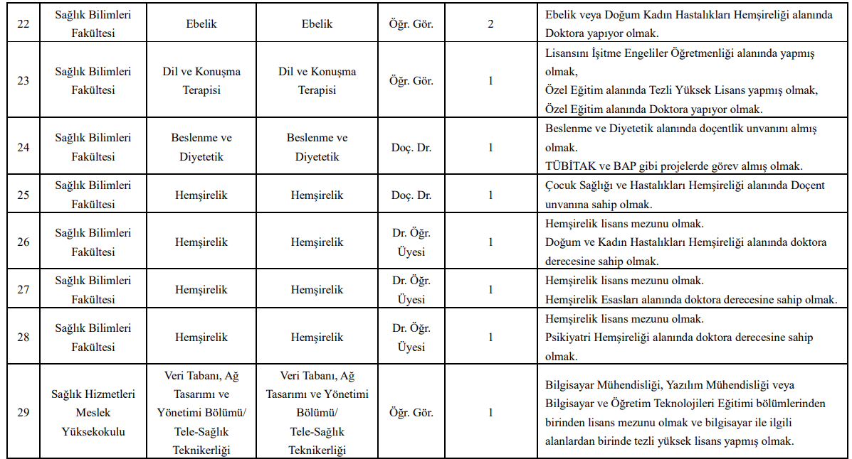 Sağlık Bilimleri Fakültesi bünyesinde Ebelik, Hemşirelik, Beslenme ve Diyetetik ile Dil ve Konuşma Terapisi bölümleri için de akademik personel alımı yapılacak. Ebelik bölümünde profesör, doçent ve öğretim görevlisi kadroları öne çıkarken, Hemşirelik bölümünde farklı uzmanlık alanlarında doktor öğretim üyesi ve doçent alımları bulunuyor.